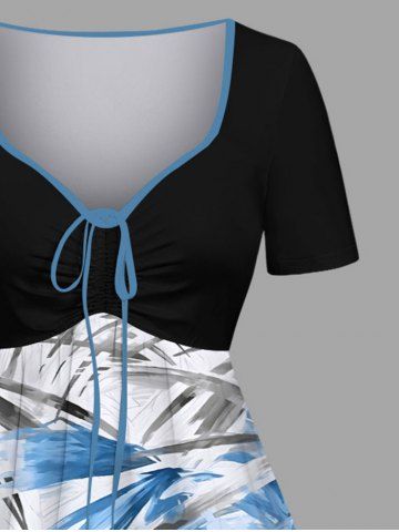 Plus Size Tropical Leaf Watercolor Print Cinched Hawaii Dress - Black - 5x