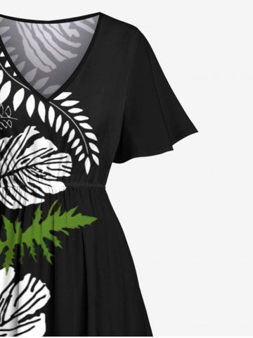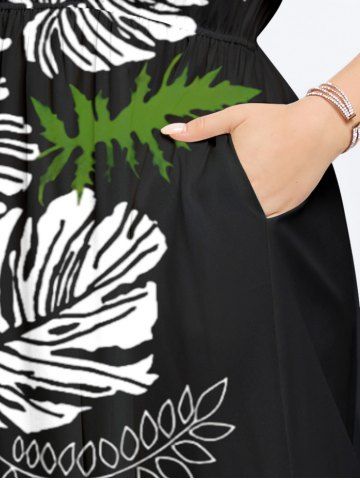 Plus Size Tropical Leave Branch Floral Print Hawaii Split Pocket A Line Midi Dress - Black - 6x