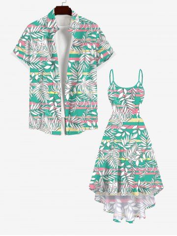 Plus Size Tropical Leaves Colorful Striped Print Hawaii High Low Asymmetric Backless A Line Cami Dress - Green - L