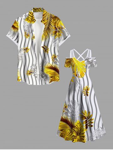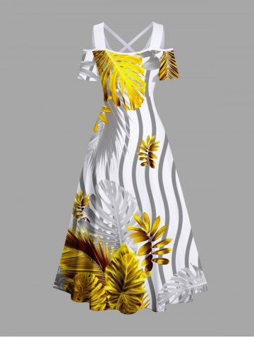 Graphic Dresses > Plus Size Tropical Leaves Contrast Zig Zag Striped Print Hawaii Cold Shoulder Crisscross A Line Maxi Dress