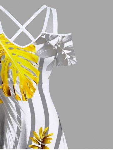 Graphic Dresses > Plus Size Tropical Leaves Contrast Zig Zag Striped Print Hawaii Cold Shoulder Crisscross A Line Maxi Dress