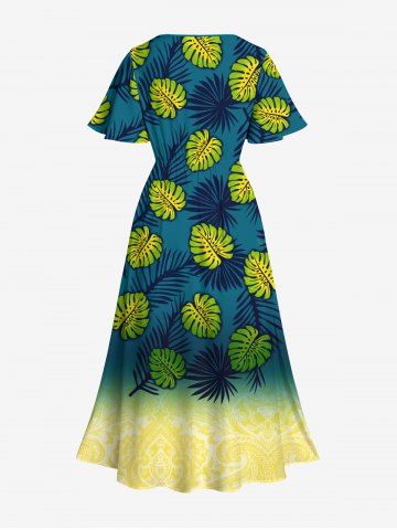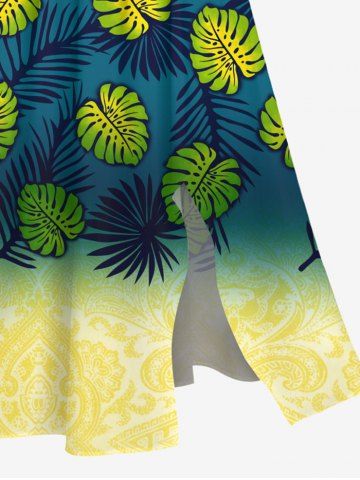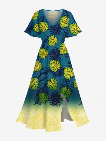 Graphic Dresses > Plus Size Tropical Leaves Dip Dye Ombre Print Hawaii Split Pocket A Line Midi Dress