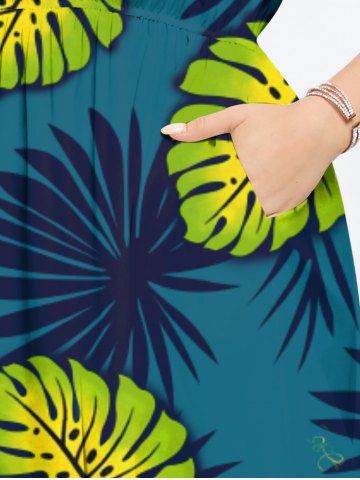 Plus Size Tropical Leaves Dip Dye Ombre Print Hawaii Split Pocket A Line Midi Dress - Green - 2x