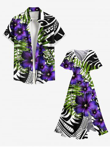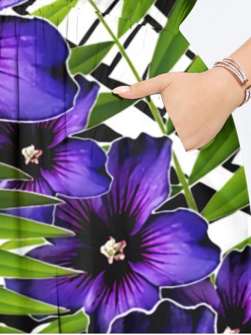 Plus Size Tropical Leaves Floral Ethnic Graphic Print Hawaii Split Pocket A Line Midi Dress - Purple - L