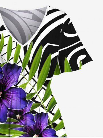 Plus Size Tropical Leaves Floral Ethnic Graphic Print Hawaii Split Pocket A Line Midi Dress - Purple - 1x