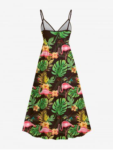 Plus Size Tropical Leaves Floral Flamingo Print Hawaii Surplice A Line Cami Dress - Deep Coffee - L