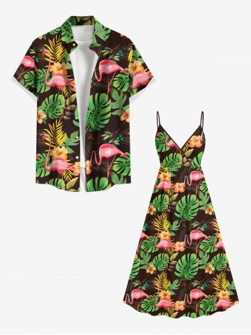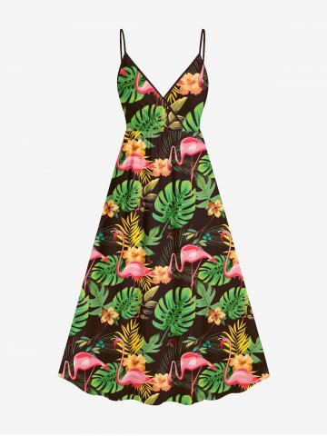 Graphic Dresses > Plus Size Tropical Leaves Floral Flamingo Print Hawaii Surplice A Line Cami Dress