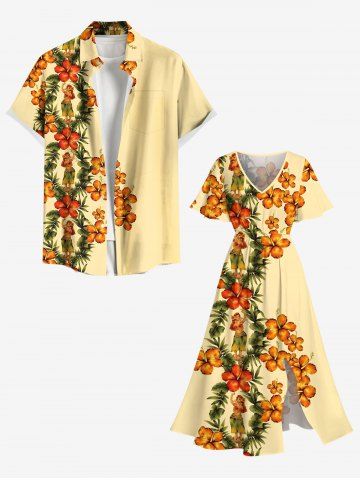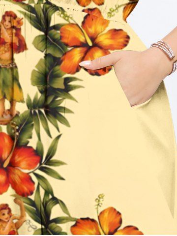 Plus Size Tropical Leaves Floral Hula Dancer Print Hawaii Split Pocket A Line Midi Dress - Yellow - S