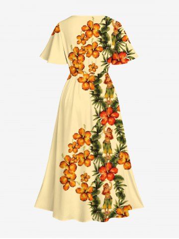 Plus Size Tropical Leaves Floral Hula Dancer Print Hawaii Split Pocket A Line Midi Dress - Yellow - 2x