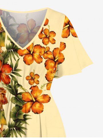 Plus Size Tropical Leaves Floral Hula Dancer Print Hawaii Split Pocket A Line Midi Dress - Yellow - 3x