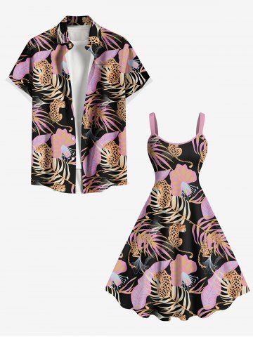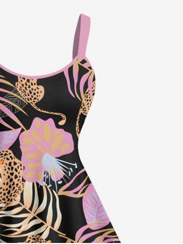 Plus Size Tropical Leaves Floral Leopard Print Hawaii A Line Tank Dress - Black - L