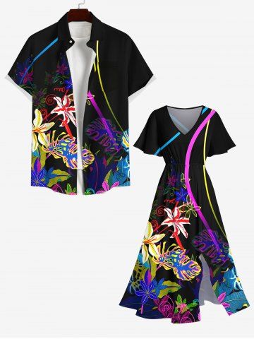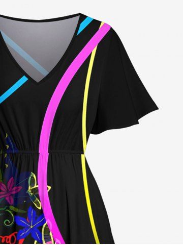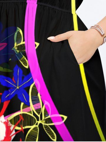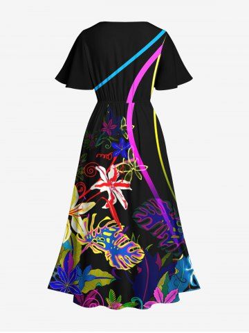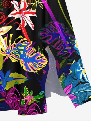 Plus Size Tropical Leaves Floral Light Beam Print Hawaii Split Pocket A Line Midi Dress - Black - 2x