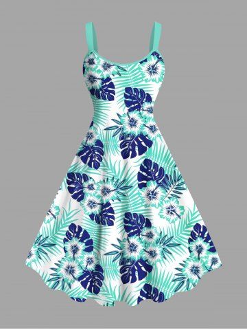 Plus Size Tropical Leaves Floral Print Hawaii A Line Tank Dress - Light Blue - Xs