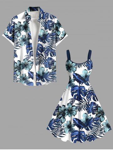 Plus Size Tropical Leaf Flower Print Hawaii A Line Tank Dress - Blue - 1x