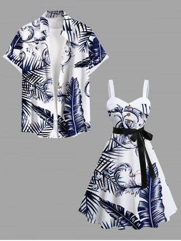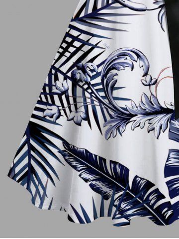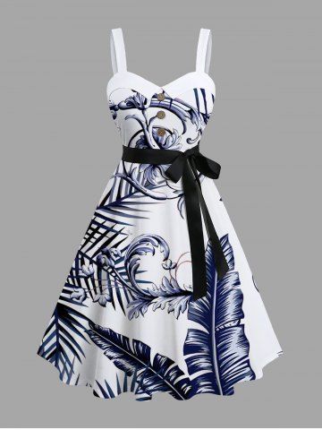 Plus Size Tropical Leaf Flower Print Hawaii Button A Line Tank Dress with Removable Belt - White - S