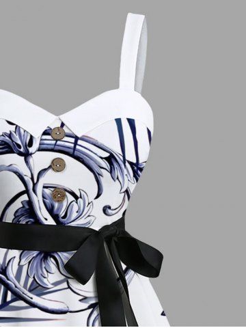 Plus Size Tropical Leaf Flower Print Hawaii Button A Line Tank Dress with Removable Belt - White - 2x
