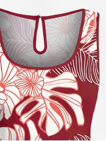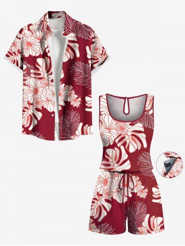 Plus Size Tropical Leaf Flower Print Hawaii Drawstring Pocket Romper - Red - 5x