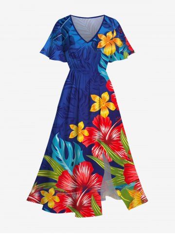 Graphic Dresses > Plus Size Tropical Leaves Floral Print Hawaii Ombre Split Pocket A Line Midi Dress