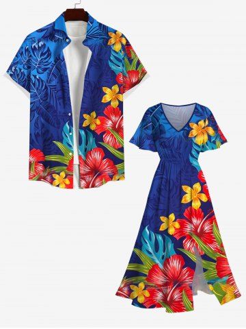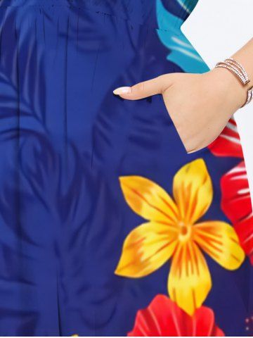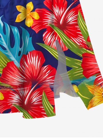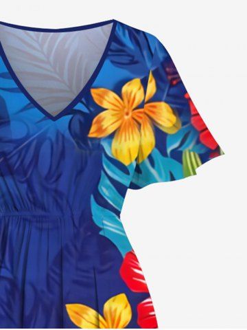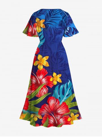 Plus Size Tropical Leaves Floral Print Hawaii Ombre Split Pocket A Line Midi Dress - Sky Blue - Xs