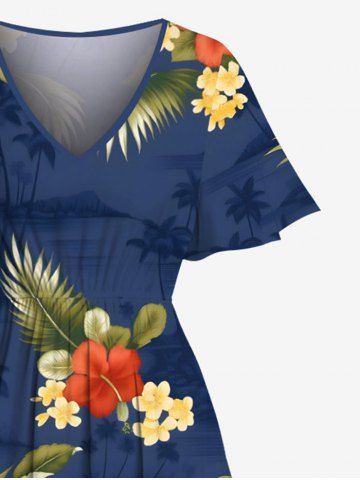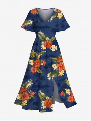 Plus Size Tropical Leaf Flower Print Hawaii Split Pocket A Line Midi Dress - Blue - 1x