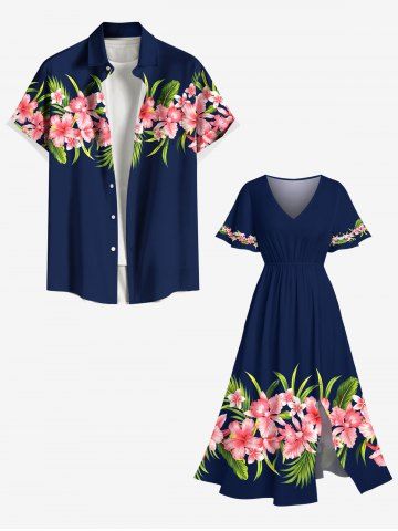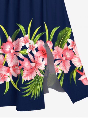 Plus Size Tropical Leaf Hibiscus Flower Print Hawaii Pocket Split A Line Midi Dress - Blue - 5x