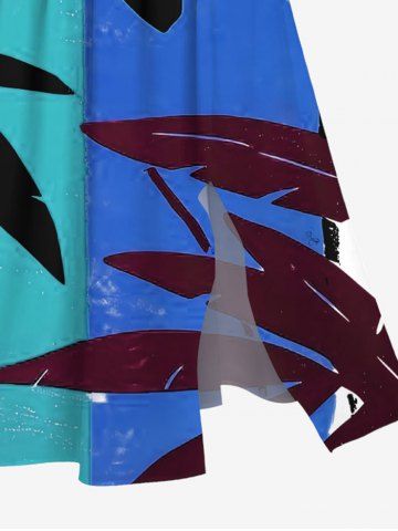 Plus Size Tropical Leaves Painting Colorblock Print Hawaii Split Pocket A Line Midi Dress - Blue - 1x