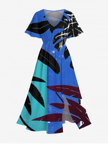 Plus Size Tropical Leaves Painting Colorblock Print Hawaii Split Pocket A Line Midi Dress - Blue - 2x