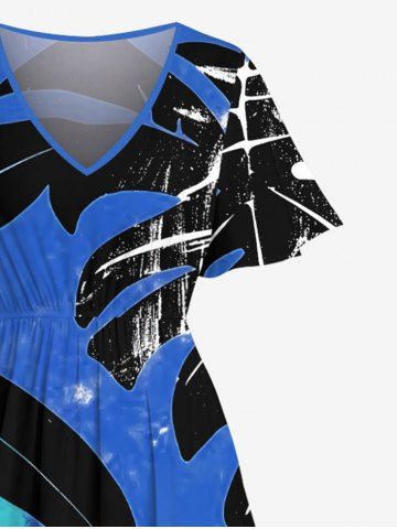 Plus Size Tropical Leaves Painting Colorblock Print Hawaii Split Pocket A Line Midi Dress - Blue - 4x