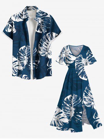 Plus Size Tropical Leaves Print Hawaii Ombre Split Pocket A Line Midi Dress - Blue - Xxs