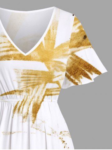 Plus Size Tropical Leaf Print Hawaii Split Pocket A Line Midi Dress - White - 4x