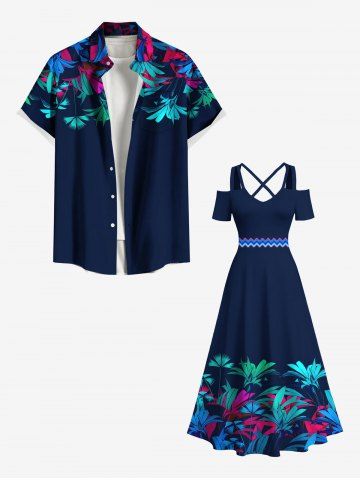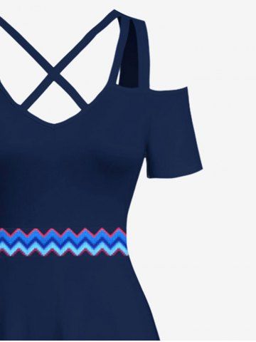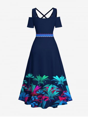 Plus Size Tropical Leaf Zig Zag Print Hawaii Cold Shoulder Crisscross Strappy A Line Maxi Dress - Deep Blue - 1x