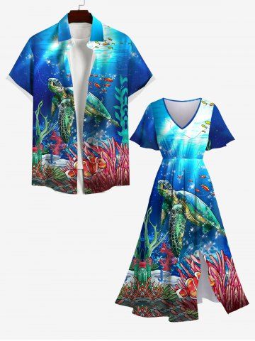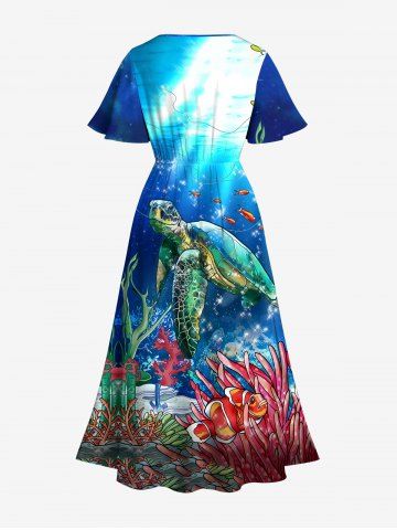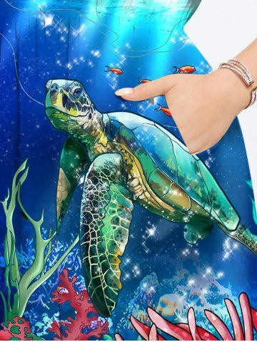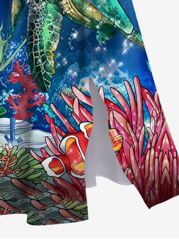 Hawaii Plus Size Turtle Fish Coral Sea Creatures Glitter Sunlight Print Split Sea Creatures A Line Dress - Blue - 5x