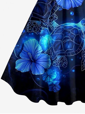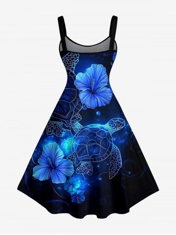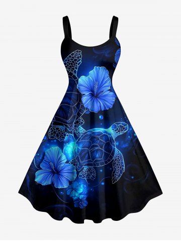 Plus Size Turtle Hibiscus Flowers Print Hawaii Tank Dress - Deep Blue - 4x