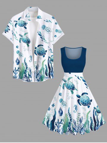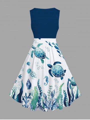 Plus Size Turtle Jellyfish Seaweed Fish Print Hawaii Sea Creatures Vintage Swing A Line Dress - Blue - Xs