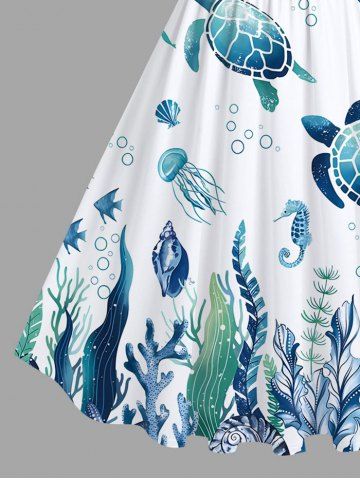 Plus Size Turtle Jellyfish Seaweed Fish Print Hawaii Sea Creatures Vintage Swing A Line Dress - Blue - L