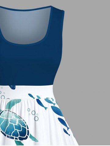 Plus Size Turtle Jellyfish Seaweed Fish Print Hawaii Sea Creatures Vintage Swing A Line Dress - Blue - 3x