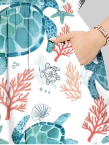 Plus Size Turtle Paisley Flowers Leaf Starfish Print Split Hawaii Midi Dress - White - L