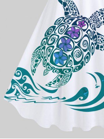 Plus Size Turtle Sea Waves Flowers Print Hawaii Tank Dress - White - 3x