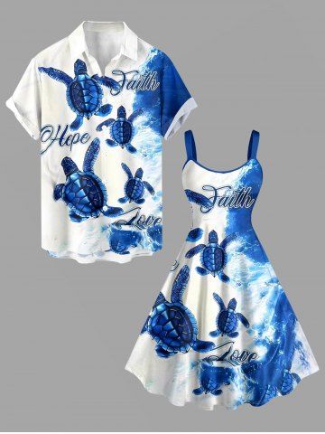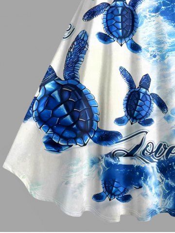 Plus Size Turtle Sea Waves Print Hawaii Sea Creatures A Line Dress - Blue - 4x