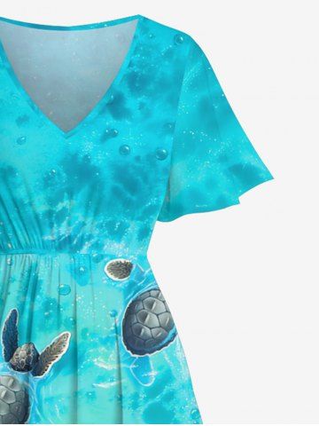 Plus Size Turtle Shell Ombre Sea Beach Printed Hawaii Sea Creatures Split Pocket A Line Midi Dress - Sky Blue - Xs