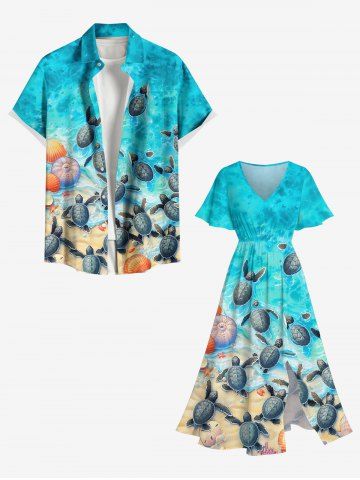 Plus Size Turtle Shell Ombre Sea Beach Printed Hawaii Sea Creatures Split Pocket A Line Midi Dress - Sky Blue - 3x