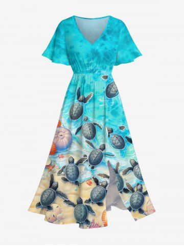Plus Size Turtle Shell Ombre Sea Beach Printed Hawaii Sea Creatures Split Pocket A Line Midi Dress - Sky Blue - 6x