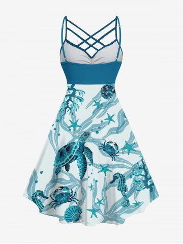 Plus Size Turtle Starfish Shell Crab Sea Horse Print Ruched Lattice Crisscross Straps Hawaii Dress - Peacock Blue - Xxs