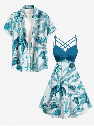 Plus Size Turtle Starfish Shell Crab Sea Horse Print Ruched Lattice Crisscross Straps Hawaii Dress - Peacock Blue - 4x