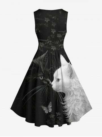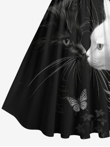 Plus Size Two Tone Cat Butterfly Floral Print Vintage Swing A Line Dress - Black - 4x