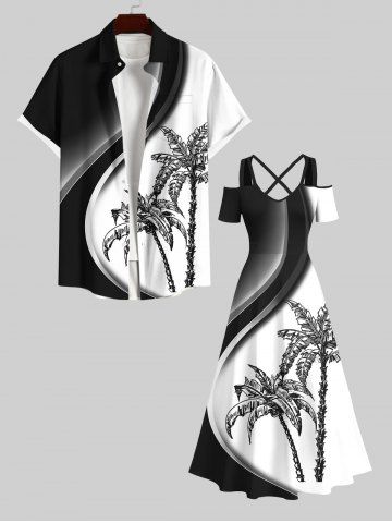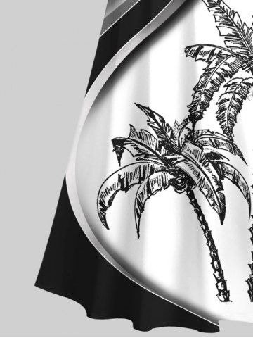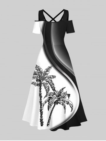 Graphic Dresses > Plus Size Two Tone Coconut Tree Highway Colorblock Print Cold Shoulder Crisscross Hawaii Maxi Dress
