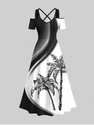 Graphic Dresses > Plus Size Two Tone Coconut Tree Highway Colorblock Print Cold Shoulder Crisscross Hawaii Maxi Dress