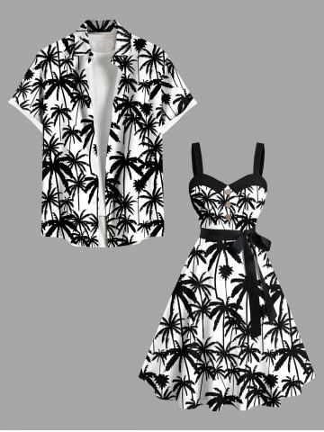 Graphic Dresses > Plus Size Two Tone Coconut Tree Print Buttons Turn Down Collar Hawaii Dress With Belt