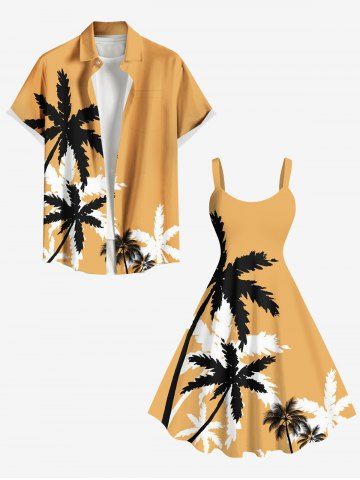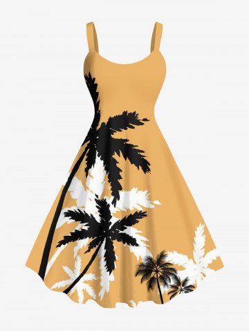 Plus Size Two Tone Coconut Tree Print Hawaii A Line Tank Dress - Deep Yellow - S