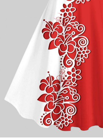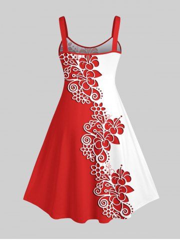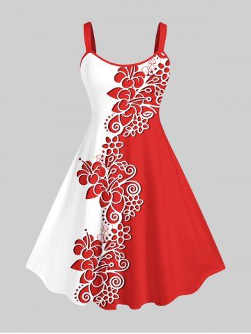Plus Size Two Tone Colorblock Flowers Print Hawaii Tank Dress - Red - Xs